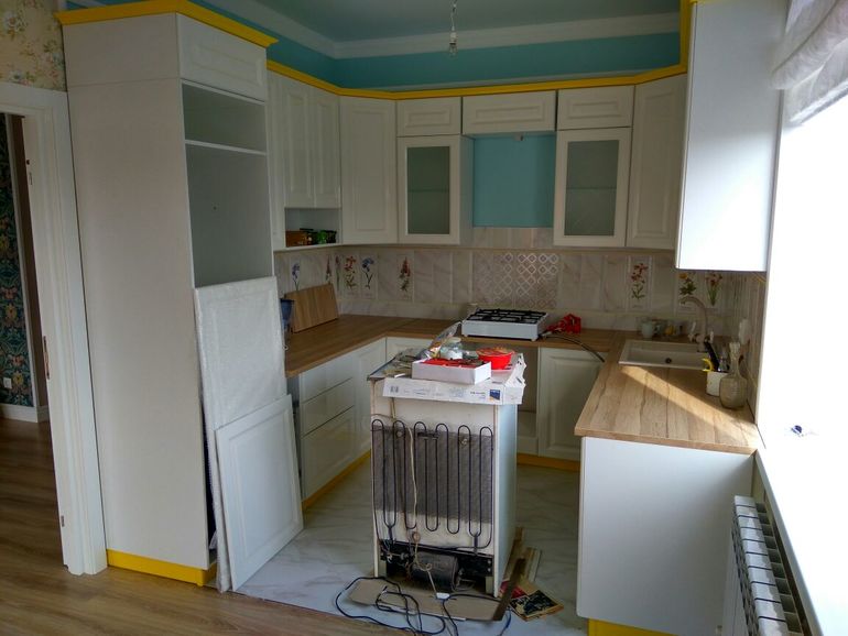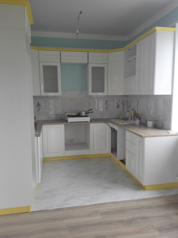 Увидела вашу кухню и как будто дежавю )) хотя у меня она другая, и хотела я другое, не как сейчас получилось, но вышло, что вышло.. на вашу очень похожа цветами.. Я задумывала классику, но на массив денег не хватило )) да и хотела под кафе, но дернуло меня на белую и яркие цвета.. Духовка и вытяжка будут беж классика. Ручки - бронза. Цвета здесь не очень передаются..