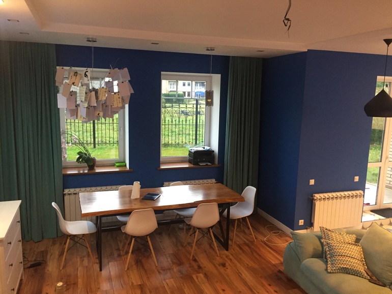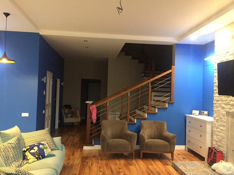 А мне все очень нравится, в тч кресла, я бы единственное их перетянула. Сделала бы их с рисунком, когда появится камин и декор будет фантастика. Синий балдежный)