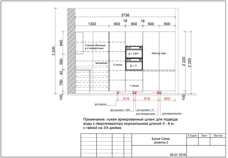 Алевтина Вам верно прислала схему установки розеток на кухне. Их редко, когда, правильно ставят)) Для того, чтобы правильно рассчитать количество розеток нужен дизайн-проект кухонного гарнитура с нанесенными на нем розетками. Пример: