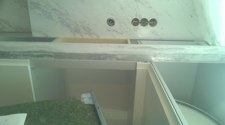 вообще все кухонные элементы идут меньше, чем столешница, именно для коммуникаций и погрешности кривизны стен. У нас стены ровные и труб нет, так что я просила сделать максимально вплотную к стене, чтоб ящики были глубже