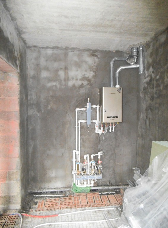 Котел переносить нельзя. Я думаю, может столешницу сделать на 5 см больше. Тумбы отодвинуть на те же 5 см, а столешку положить вплотную к стене.