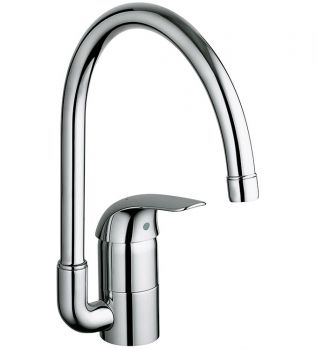 У меня литая мойка глубиной 20 см и высокий смеситель (высота крана примерно 29, а излива 27см).