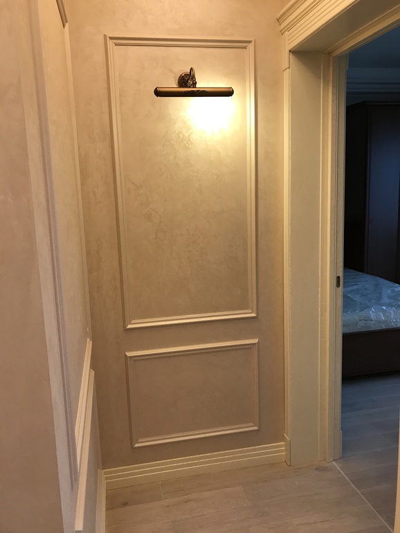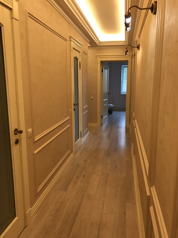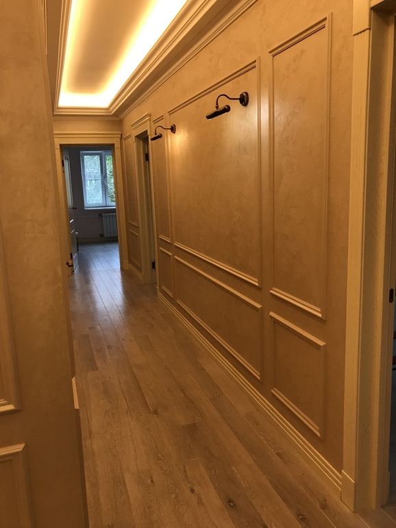Коридор узкий и довольно темный, поэтому перегружать картинами не стоит. Я бы повесила зеркала. Нейтрально, и раздвигает пространство. Или в узкие молдинги зеркала, а в большие (с подсветкой) ч/б фото (что-то крупное, светлое, без мелких деталей).