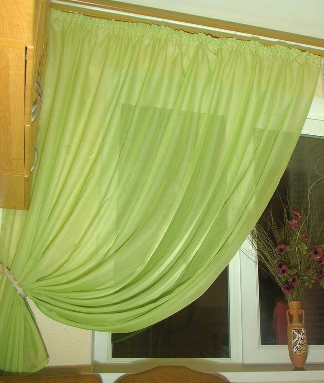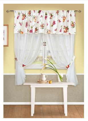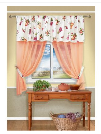я в ступоре какие сюда нужны занавески, то что они должны быть легкие и воздушные, это я понимаю, но цвет? избитый белый? думала оранжевый, сиреневый, зеленый, но как-то слабо представляю себе их, будет слишком ярко для маленькой кухни, плюс я часто открываю окно и надо чтоб занавесок было две по бокам, выполнять они будут чисто эстетическую функцию, от солнца загораживаться не хочу. Выбрала такой вариант и что-то засомневалась: