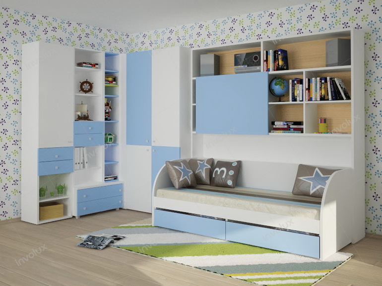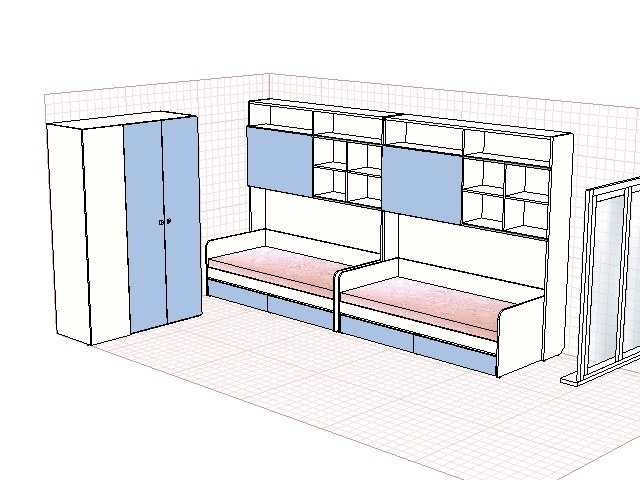 у вас вроде комната позволяет расположить 2 отдельные и сделать стеллажи/ полки не над кроватями, в серии солнечный город много модулей и угловых шкафов с полками и просто полок