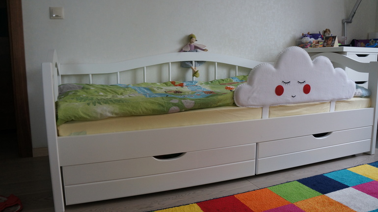 Кровати делали на заказ, ф-ка Альянс 21 век, ждали 3 недели, сосна. Взяли на вырост, до свадьбы, надеюсь, 80 на 190. Все переживала за младшую, чтоб она не слетела ночью, кровать же без бортика. Думала буду приставлять стулья на ночь, потом нашла бортики для кроватей универсальные, но они такие страшные(( И в итоге нашла мастерицу, которая сделала нам то что нужно и + красиво. Теперь в девчачьей комнате стало уютнее днем и безопасно ночью!