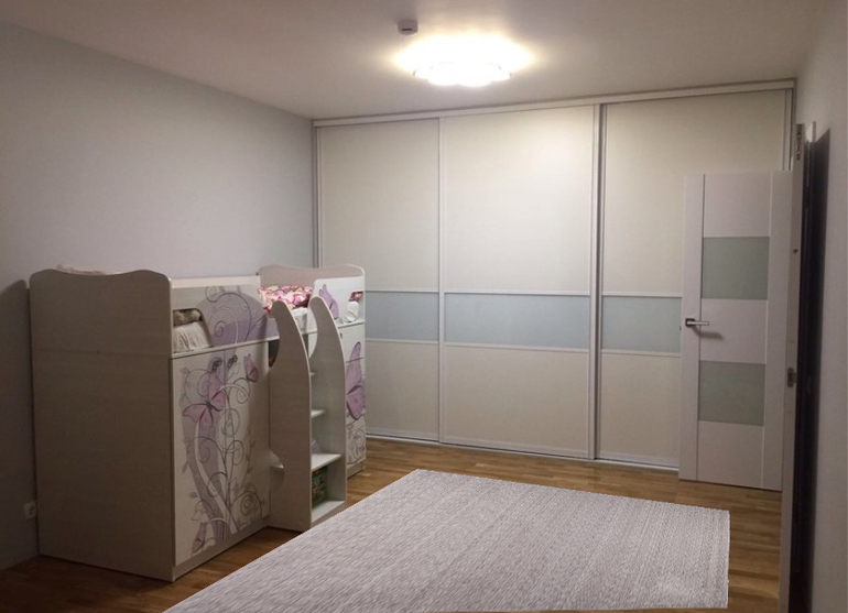 У Вас присутствует геометрия на двери на шкафу, а на кровати добавляются еще бабочки и завитушки, поэтому лучше все-таки однотонный ковер, и думаю, серо-белый. Примерила серо-сиреневый, не очень как-то: