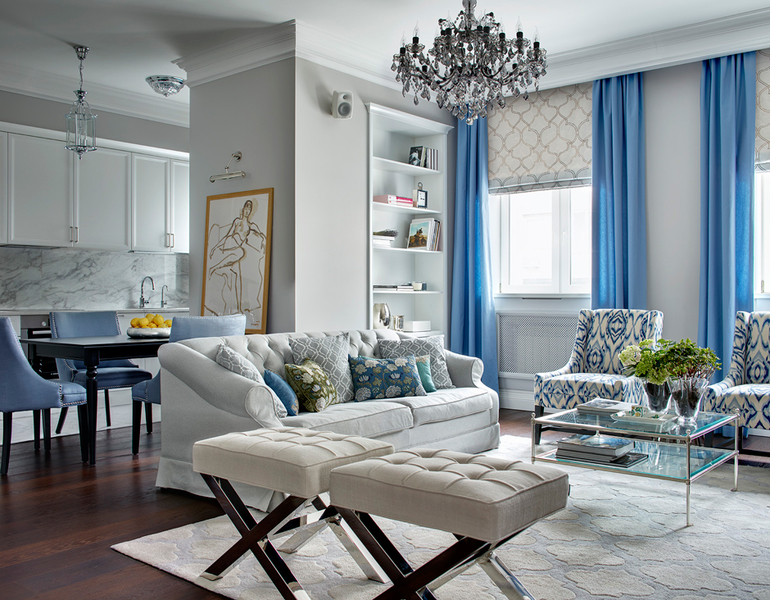 Шторы хочу синие, кухня белая и обеденная мебель тоже белая.