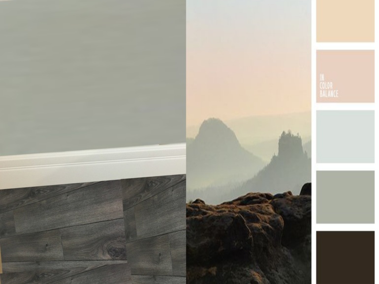 В любом случае цвет здесь нужен гораздо светлее того образца, который вы приложили к стене. Так как тот цвет (ваш) в массе будет смотреться очень мрачно, учитывая, что и полы темно-серые. Серый, не уходящий ни в холод ни в желтый, т.е. нейтральный-Ваш вариант.
