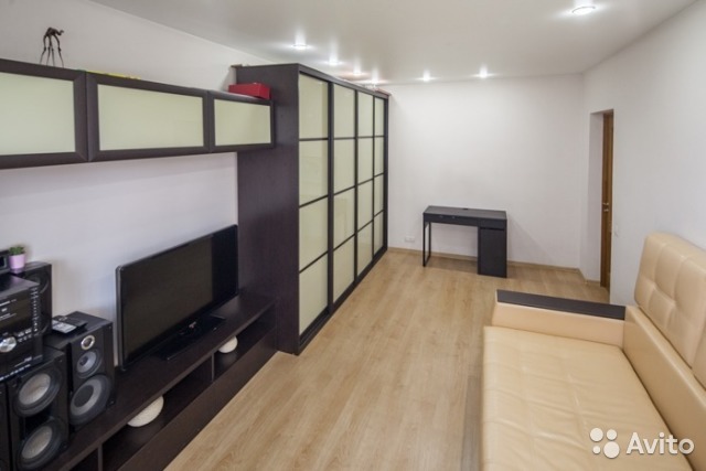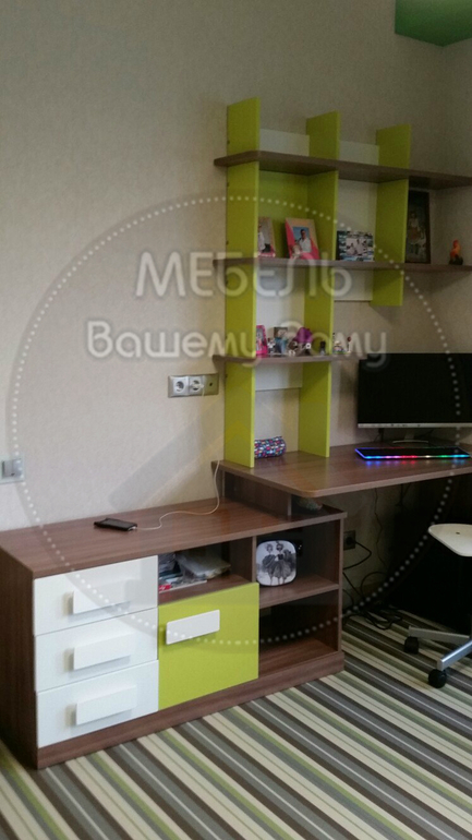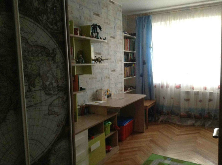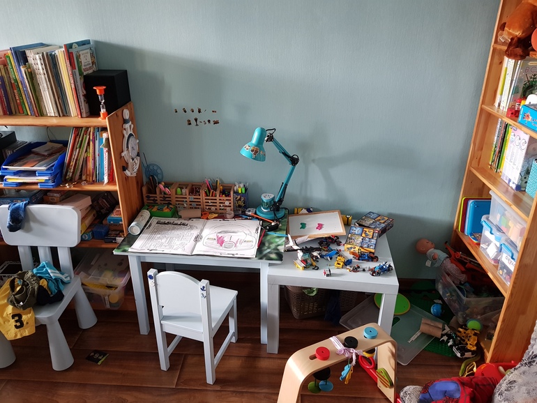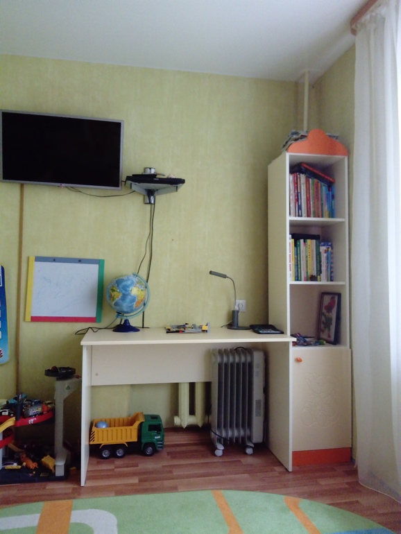 Напротив входа в комнату между стеллажами с книгами и игрушками. Это игровая зона. А слева у входа на балкон шкаф и кровать. Освещения достаточно, люстра на 6 плафонов и настольная лампа. Везде энергосберегающие лампы на 100вт.