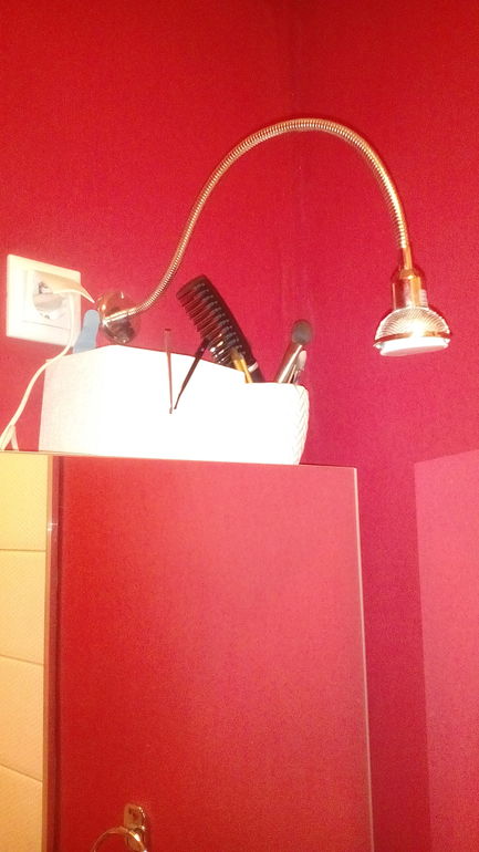 У меня один светодиодный яркий светильник на длинной ноге, включается отдельно от верхнего света. У шкафчика крашусь, направляю куда нужно, вот тут видно кусочек его глаза)