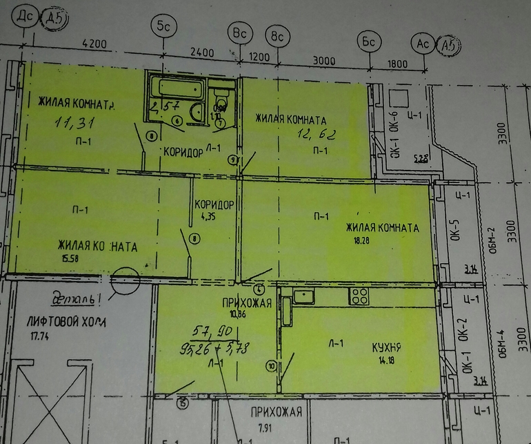 Во-первых, избавляемся от двери в зал - переносим ее напротив входа в детскую. Проем закладываем газобетонными блоками.