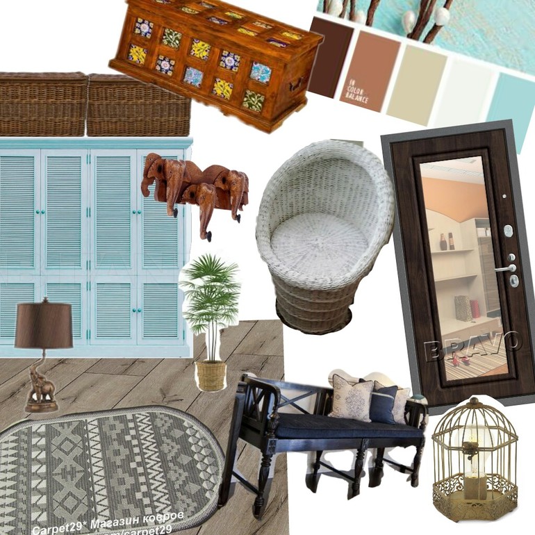 А дальше в углу, буквой Г, два шкафа, не купе, а обычные. Вот тут стоит отметить, что пришла мне в голову мысль оформить коридор в колониальном стиле (конечно громко сказано🙈 но хотя бы с намеком, на колониальной стиль😁)) Коллаж моей задумки прилагаю, так понятней будет (программа на телефоне, пальцы немного корявые, за неаккуратность извиняюсь, но суть ясна).