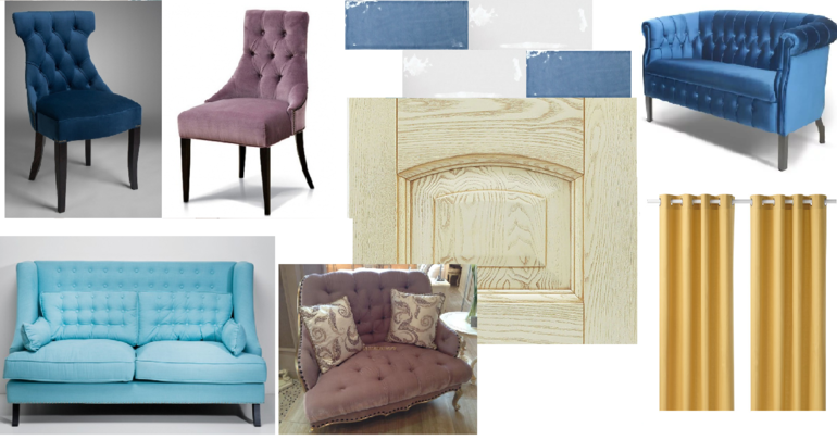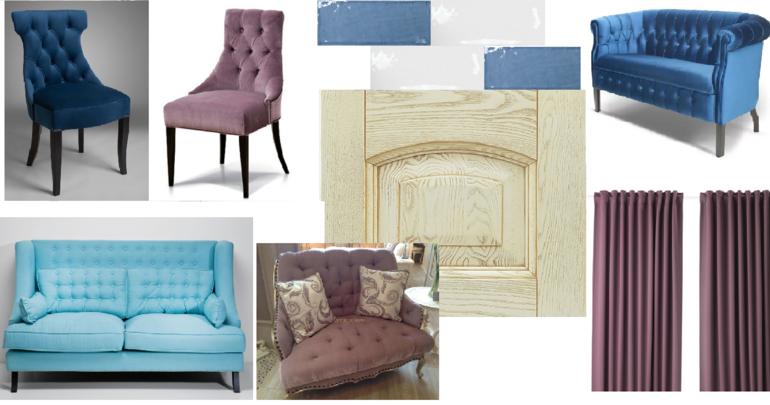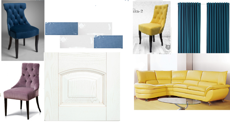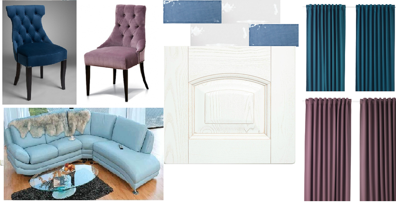 Кинь ссылку на свои стулья и диван, я тебе в коллаж вставлю. Твоя классная сине-белая плитка и твои фасады рояль с горчичным диваном и синими или голубыми шторами будет здорово. Но лиловые стулья никак сюда не катят.