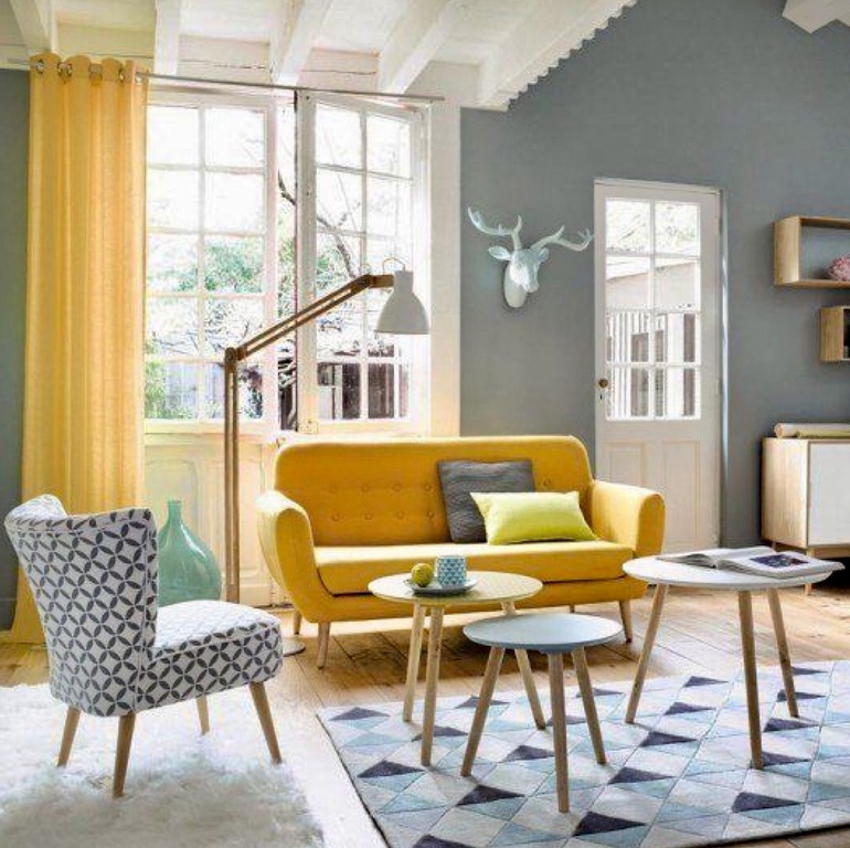 Стены, серо-голубые шторы.. у меня такая цвето-пепедача получилась. Больше серое, чем голубое даже. Цвета нравятся, и горчичный отдельно тоже. А вместе не очень.