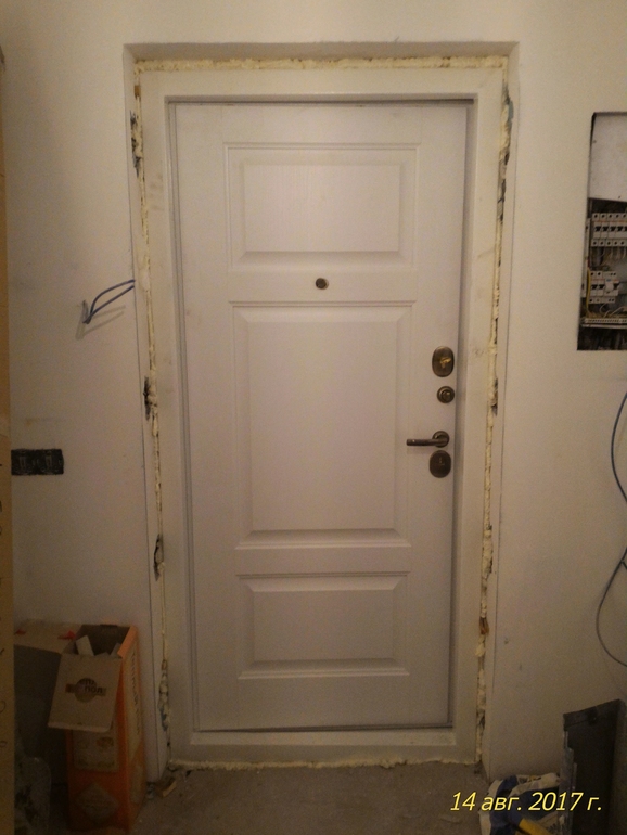 . Здесь на фото еще нет доборов и наличников. Для входной двери доборы и наличники купила в Леруа, из дерева, стоили копейки, мои рабочие их покрасили в белый цвет и установили сами. Дверь очень нравится.