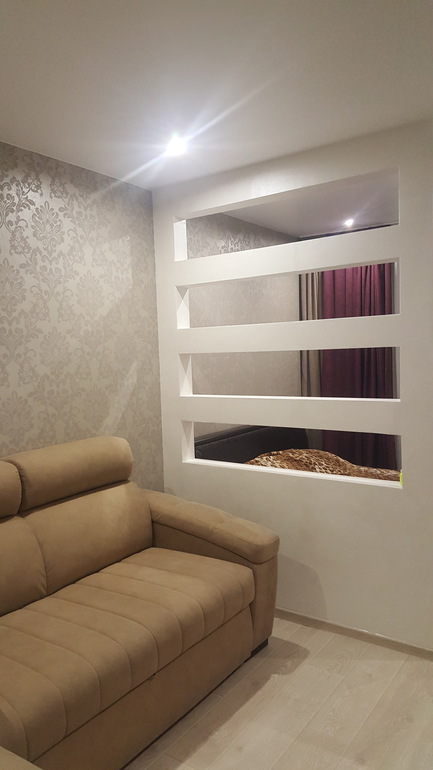 Интерьерное решение гостинойРемонт в нашей квартире пришелся на чудную пору- мою беременность. Мозг,как вы знаете, начинает работать в этот период в каком то особом режиме. Ну и навыдумывала я, что хочу перегородку в комнате. Полагалась на это фото. Все расставлено именно так, вплоть до детской кроватки. Так вот..сейчас я понимаю, что мне дико не хватает места и света в зоне, где стоит диван. А еще нам с мужем приходится спорить кто будет спать у окна, т.к. за перегородкой телевизор не видно...короче начудила я...и так теперь хочется убрать эту перегородку, вместе с кроватью и сделать просто гостинную..теперь обо всех но! У нас натяжной потолок, обои и пол-все огибает эту злосчастную перегородку. Убрав ее нужно переклеивать обои, перетягивать потолок и перекладывать ламинат. Переложить ламинат мы готовы, а вот все остальное...может быть есть у вас какие то идеи...срезать до максимума эту перегородку и как то обыграть ее..помогите,ббшечки.
