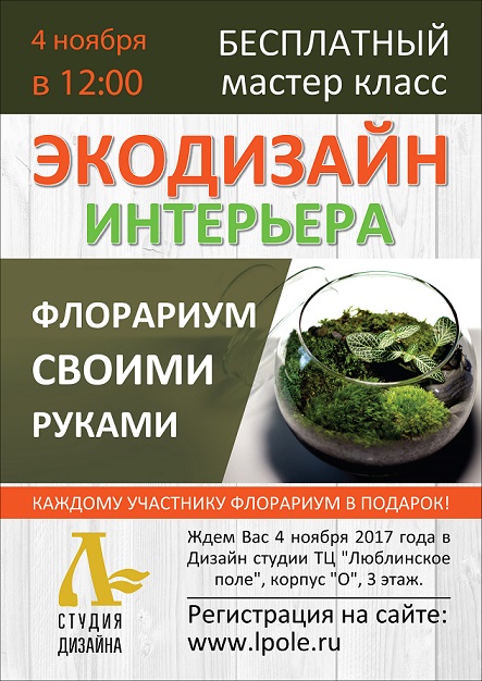 ФИТОФЛОРИСТИКА, ФЛОРИСТИКА4 ноября в Дизайн студии Торгового комплекса "Люблинское поле" пройдет бесплатный мастер класс по декорированию интерьера с помощью экологических материалов.
