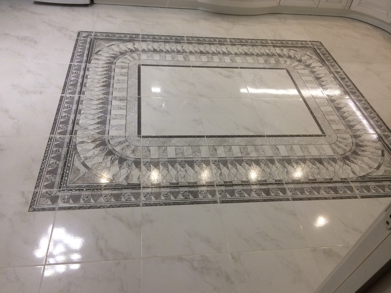 Ну если вы хотите выложить кухню и прихожую, то может сделать плавный переход как-то скомбинировать. У вас нету фото комнат? А так плитка очень красивая)) У меня на кухне тоже белая с серым.