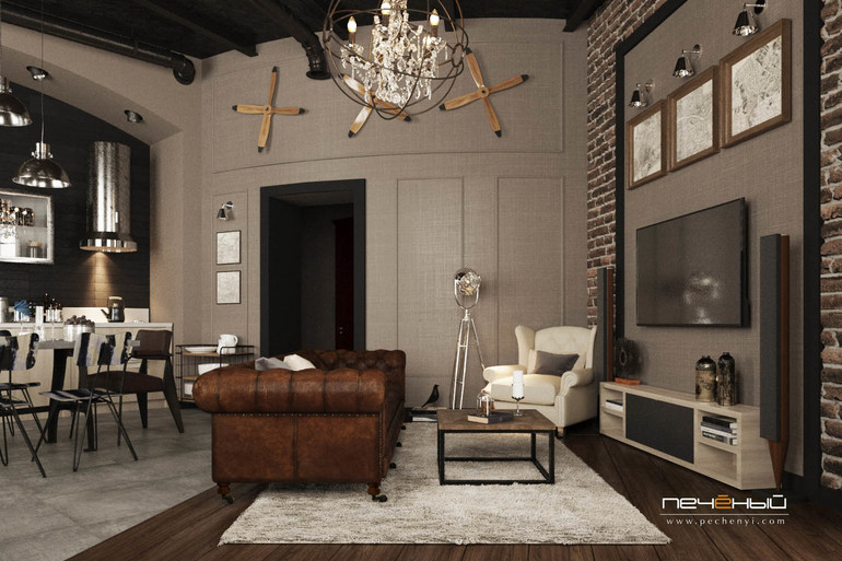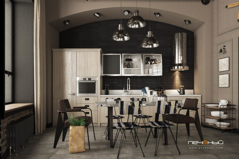 Перед нами стояла задача создать суровый мужской интерьер, поэтому цветовая гамма здесь достаточно сдержанная. Интересно, что заказчик купил кухню и обеденный стол до того, как обратился в нашу студию. Так что дизайн-проект разрабатывался уже с учётом имеющейся мебели.