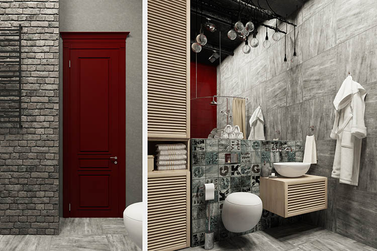 Необычно, что мужчина-холостяк предпочёл ванну душевой кабине, правда? Ванна здесь большая и удобная, для настоящего ценителя! :) В отражении зеркала видна шторка - её можно задёрнуть и принять быстрый душ. Интересное решение получилось с плиткой на полу и стене справа от умывальника.
