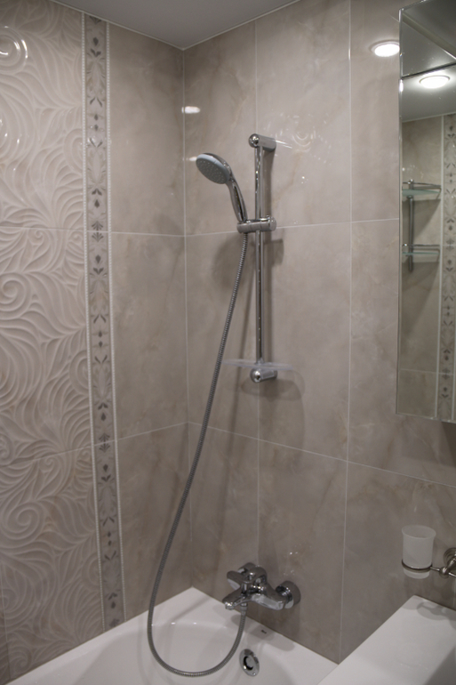 У нас обычная трехкомнатная квартира со стандартной ванной и туалетом, особо не разгуляешься в плане дизайна))) Раскладку плитки сделала сама.