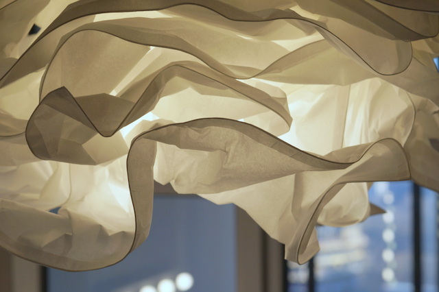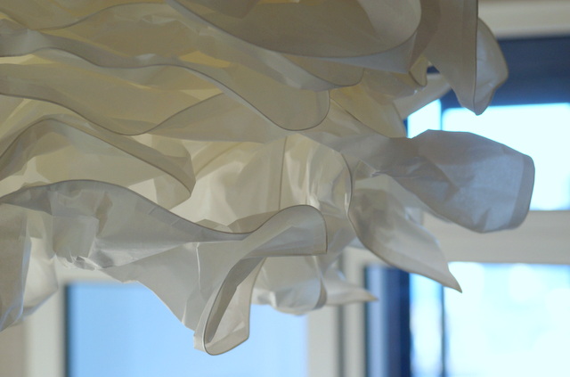 О какая! Нелепая до невозможности. Икеевская. Продавалась листами, которые надо было комкать руками. Ну мы скомкали и свисает теперь это чудо чудное с бетонного потолка на тоненьком шнурочке)) Смешно свисает, но уж лучше голой лампочки)