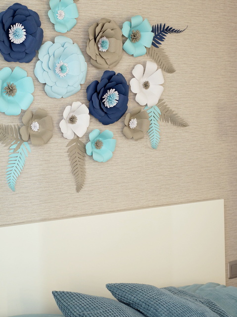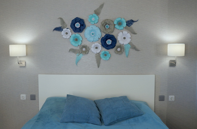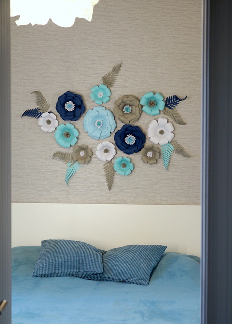 Но результат мне безумно нравится. И пусть мои цветы кривенькие, а некоторые спустя время так вообще развалились (додумалась клеить клеем-карандашом, голова садовая), но спальня выглядит гораздо интереснее.