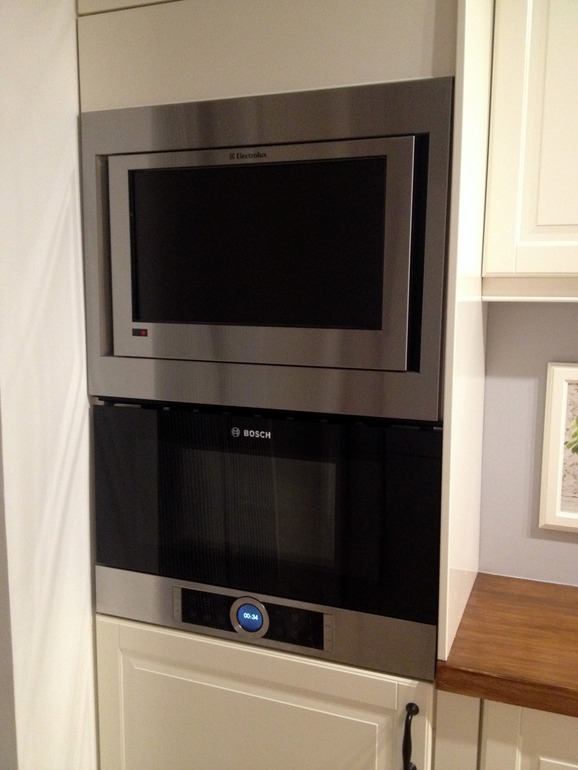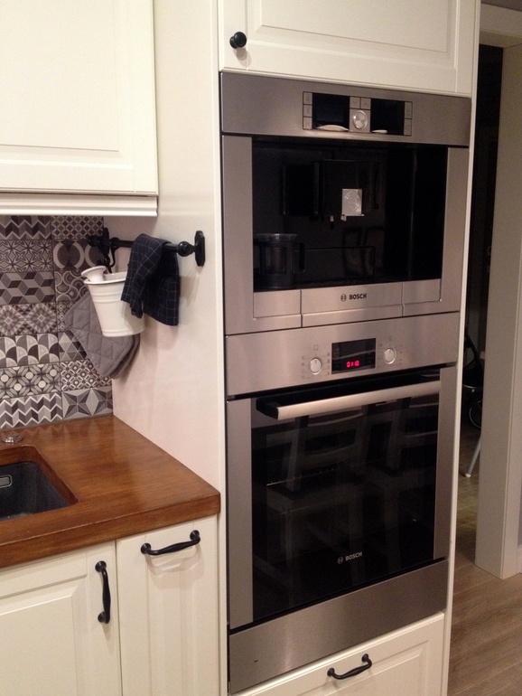 Сверху встроена кофемашина Бош. В невстроенном виде смотрится просто жутко, т.к. кажется огромной. Покупалась давно, долго стояла именно невстроенная и вызывала недоумение всех, кто ее видел. Зачем, мол, такую дуру купили, ну взяли бы маленькую капсульную. Но меня размеры не смущают, а кофе из капсул это всё-таки очень дорого. Покупаем самый простой кофе в зернах, а получается не хуже, чем в кофейнях. Я обычно балуюсь по утрам капучино. Машина полностью автоматическая, всё делает сама, в том числе и молочную пену. Промывает себя тоже сама, что очень радует. Раз в три-четыре месяца надо забрасывать в нее специальные таблетки и чистить от кофейных масел и накипи. Жаль, что сама не заливает в себя воду и не выбрасывает кофейный жмых. Кофе в постель тоже не приносит. (( Короче, прибор не идеальный, но неплохой.