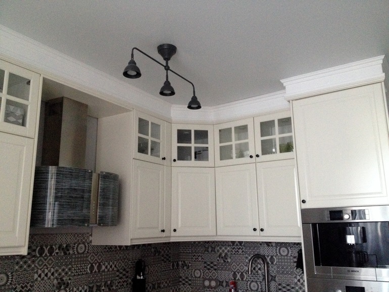 Вообще, сейчас я бы все сделала не совсем так. Фасады бы предпочла серые, фартук из белого кабанчика, вытяжку из нержавейки. Но это планы буду осуществлять уже в другой квартире, которая, надеюсь, когда-нибудь у нас все-таки появится. Я очень не хотела, чтобы над верхними шкафами бы зазор и настаивала, что в этом месте потолок необходимо опустить. Муж упирался и не хотел. В итоге всё-таки соорудили конструкцию из гипсокартона.