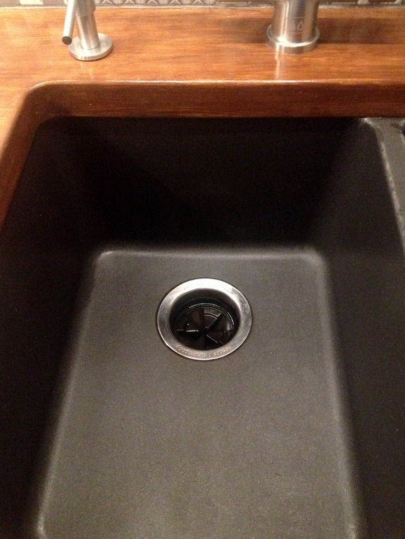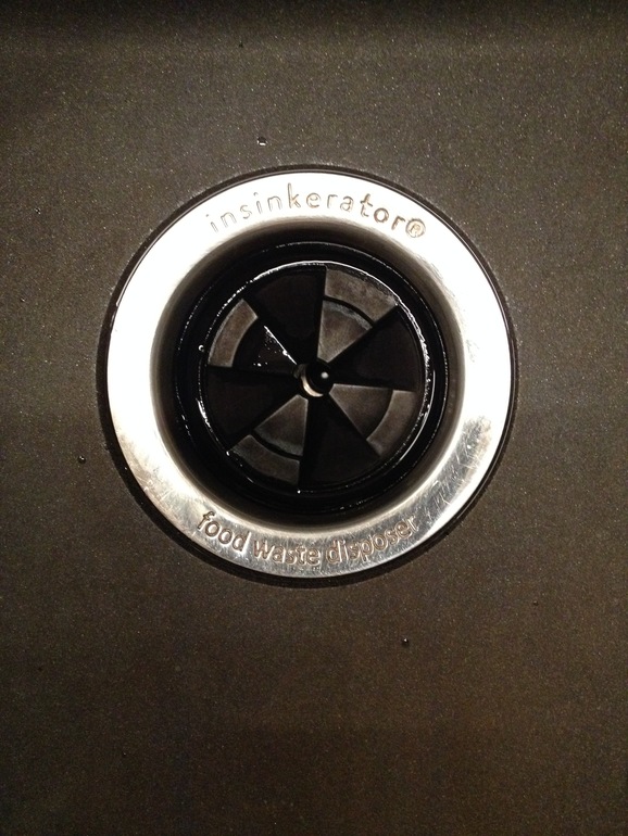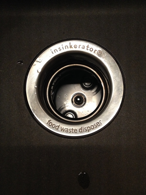 Под большой чашей установлен измельчитель InSinkErator 65. Для меня сейчас это кухонный мастхэв, сбывшаяся мечта, прибор, без которого не мыслима готовка и т.д. Прибор, кстати, довольно скромный по мощности, есть приборы гораздо мощнее, но меня этот вполне устраивает. Пользуюсь им по многу раз в день, т.к. он с удовольствием перемалывает почти все мокрые отходы (очистки от овощей, чайную заварку, пакетики от чая, салфетки, очистки от рыбы, креветок, обрезки мяса, скорлупу, косточки от фруктов и т.д.). Внешне слив выглядит как обычный: