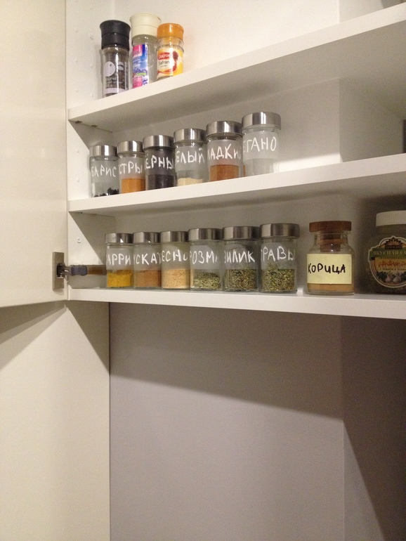 Из-за выступа глубину некоторых шкафов пришлось уменьшать. Дизайнер в Икее очень отговаривал меня от верхнего навесного шкафа, т.к. уверял, что это будет некрасиво и нефункционально. В итоге я настояла на своем и теперь это мой любимый шкаф, т.к. не люблю что-то тягать из глубин, а в нем все очень удобно стоит. Например, специи.