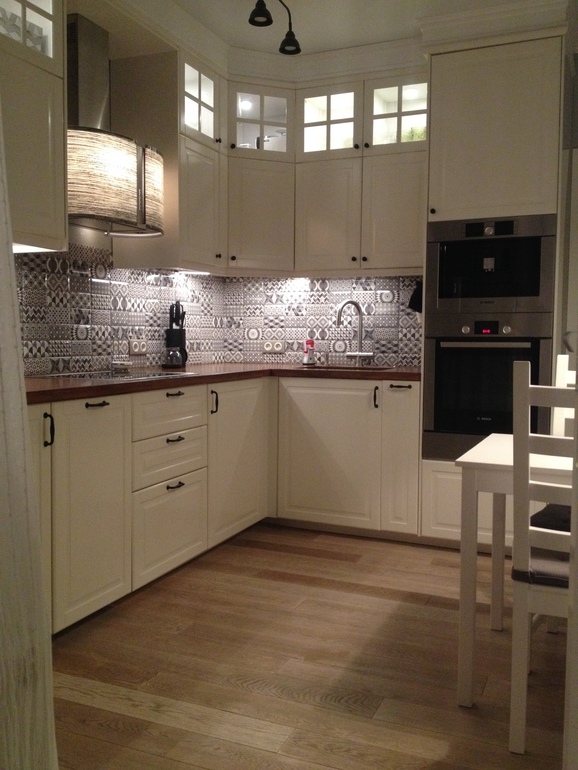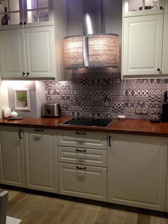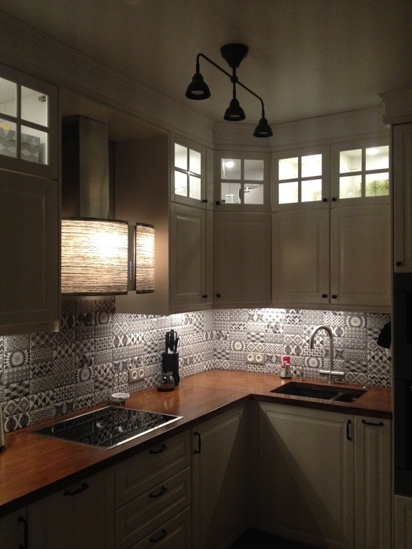 Сначала был план делать кухню на заказ. Но после того, как мы прошлись по нескольким салонам и нам озвучили цену в районе 300 тысяч за простенькую кухню (без техники, разумеется), мы решили остановиться на кухне из Икеи. Правда, икеевские кухни тоже далеко не дешевы, но большой плюс в том, что кухню можно покупать постепенно. Нашу мы покупали целый год! То одну фигулину купим, то другую, то пару ручек, то несколько полок.
