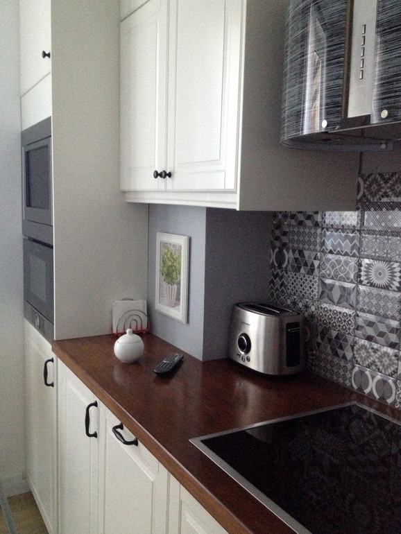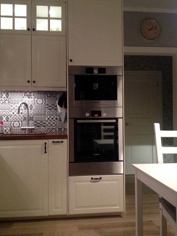Кстати, о технике. Я хотела исключительно встроенную. При этом хотелось помимо стандартного набора из духовки, посудомоечной машины, варочной панели и микроволновки впихнуть кофемашину, телевизор и шкаф для подогрева посуды. О, как же долго я ломала голову над этим тетрисом!