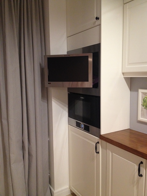 Дивайс над микроволновкой постоянно вызывает вопросы гостей, т.к. обычно никто сразу не узнает в нем телевизор. А между тем, это он и есть. Не скажу, что смотрим его часто, но иногда во время готовки включаю в качестве фона. Телевизор был куплен очень удачно на Авито за полцены, а то и меньше. Он долго пылился в витрине какого-то магазинчика техники и был давно уже снят с производства. Сейчас у Электролюкса есть новая модель подобного типа, но стоит неадекватно.