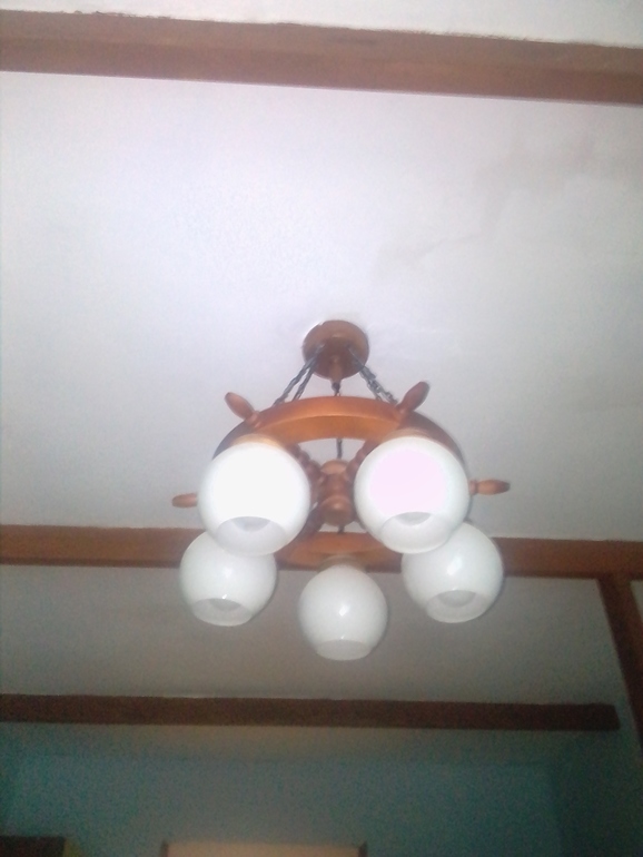 Мебель вся что и была. Для того, чтобы хоть немного "заквадратить" комнату, сделали балки на потолке. Просто доска-сороковка на ребро. Заодно "вписали" люстру в интерьер.