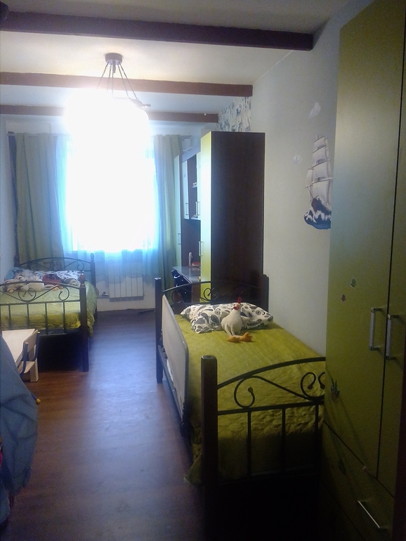 Я хотела одну кровать вдоль окна поставить, вторую перпендикулярно к ней и напротив стол. По моим прикидкам так полкомнаты оставалось свободной. И всю прошлую зиму старший спал вдоль окна. Минусы такого расположения: