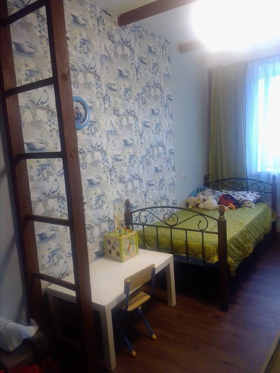 Лестницу делал наш папа из той же доски + перекладины из черенков для лопат. Я только окрасила. Функция у нее больше декоративная, ну и старший школьную одежду вешает. Еще планировался экран на батарею, но он до сих пор в состоянии запчастей.