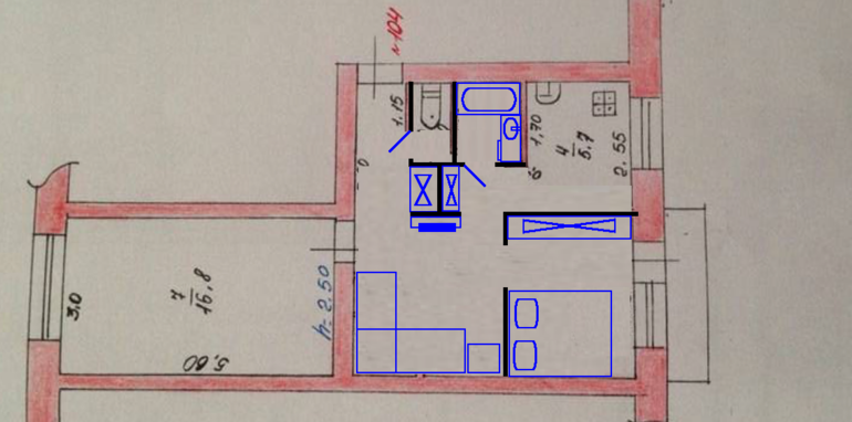 Добрый день! Мы объединили ванную комнату с туалетом, передвинув стену между ванной и кухней в сторону туалета на 0,5м. А стену коридора, которая идёт по диагонали сделали прямой.