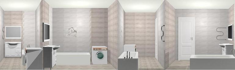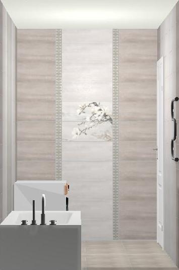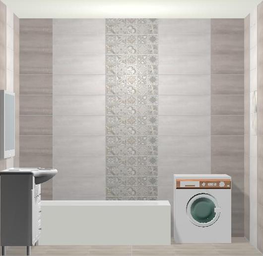 тоже сначала хотела эту коллекцию,без цветов,по моему декоры из разных стилей,и на основной плитке разводы непонятные,интересно,как у вас получиться,я бы всё-таки горизонтальными линиями по периметру положить попробывала