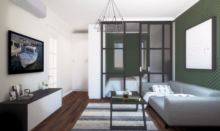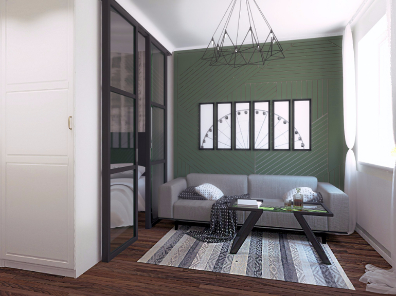 На самом деле, может оказаться, что раздвижная перегородка окажется неоправданным расходом. Такие двери дороже других решений, нужна хорошая фурнитура. В дальнейшем, их закрывать не будут, только если гости пришли. Спать будут с открытыми дверьми. И мужчина среднего роста в 180 см должен будет выработать инстинкт по сгибанию ног в коленях прежде чем встать с кровати.