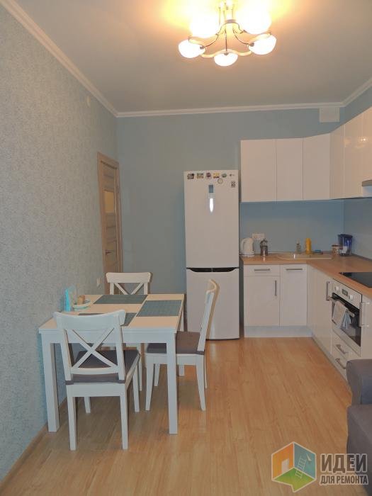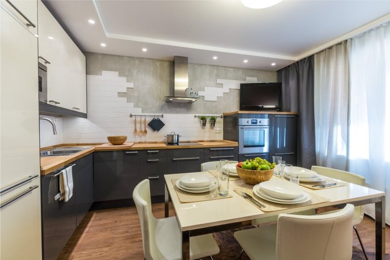 Планирую разместить еще стол со стульями и диван (ну, вроде, как кухня-гостиная). После вытяжки (в программе она только черная), где пусто, будет тв.