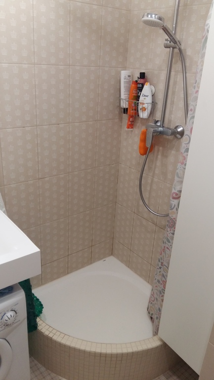 У нас мало места, ванну от прошлых хозяев убрали, душевая кабина слишком много места занимает, в строительном исполнении, побоялись затопить соседей. Поэтому купили поддон из литого мрамора и сделали вот так