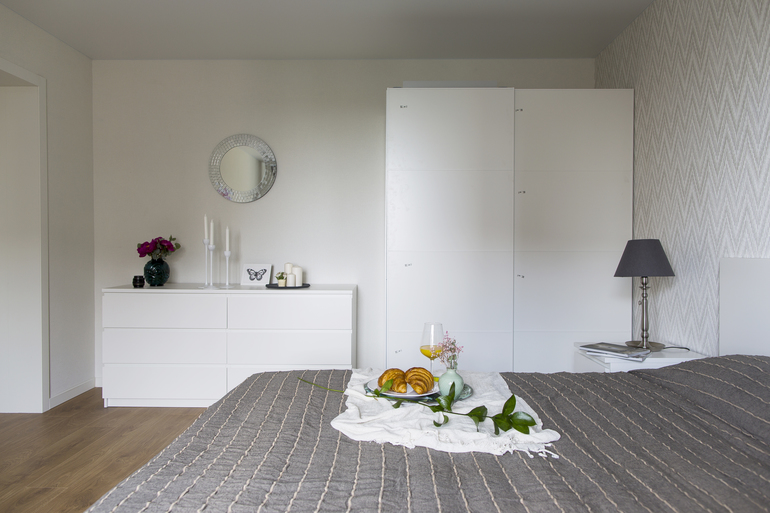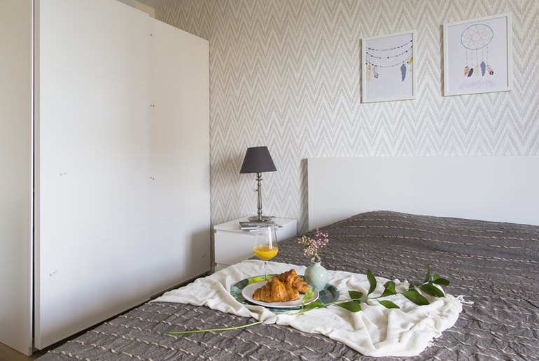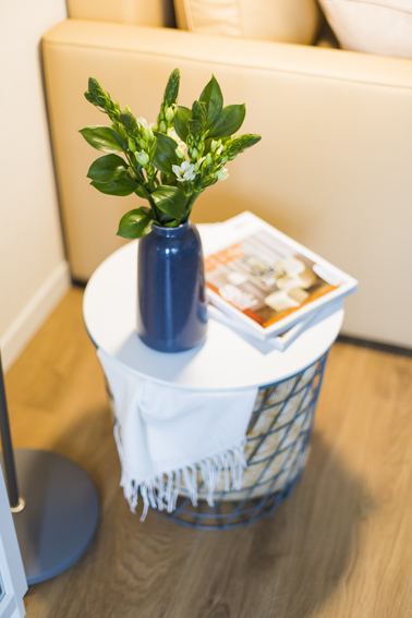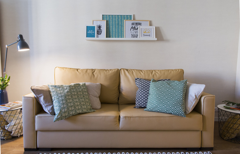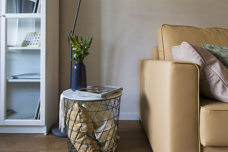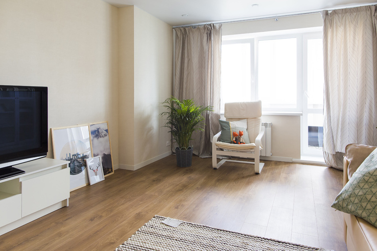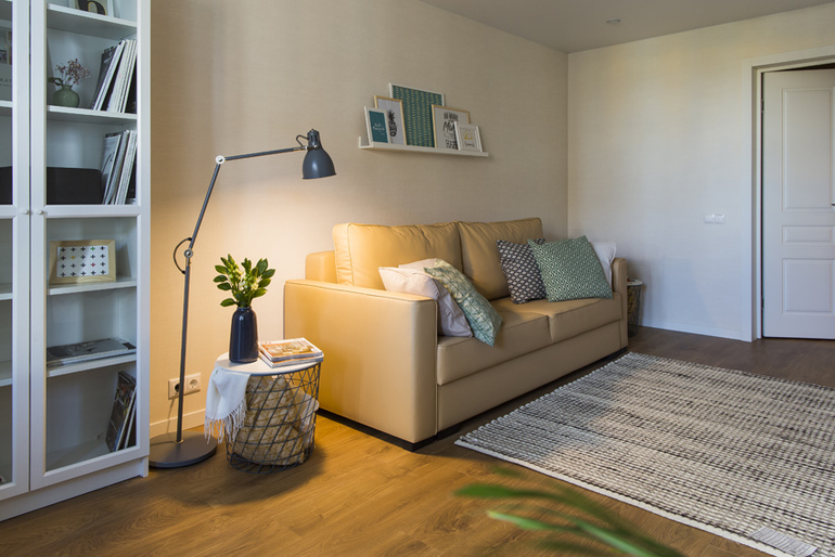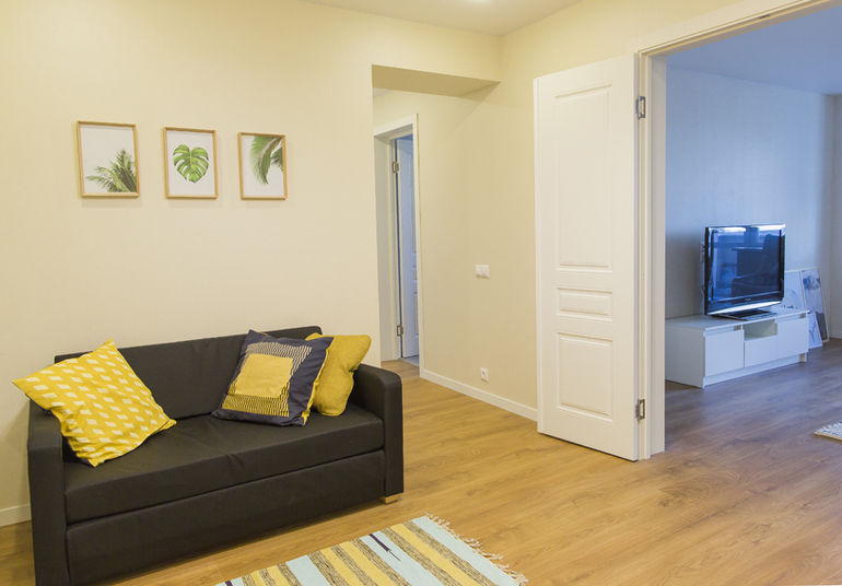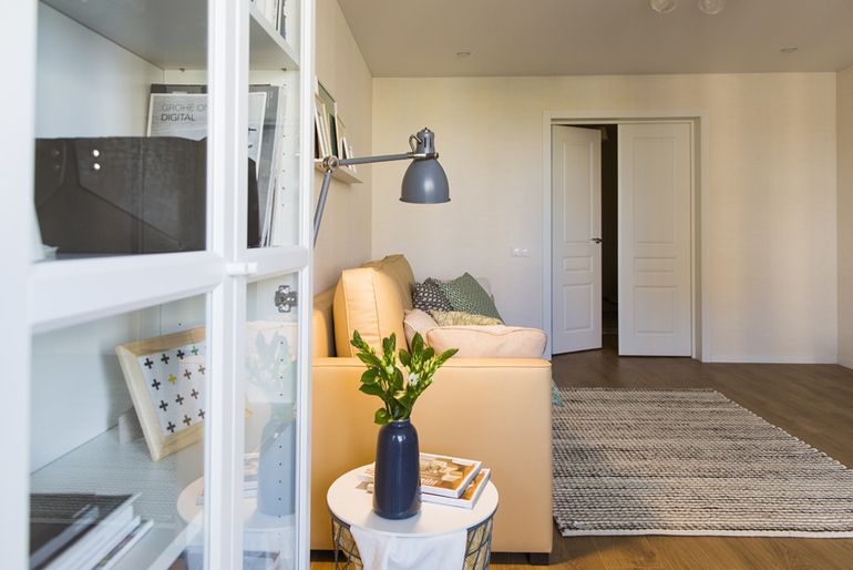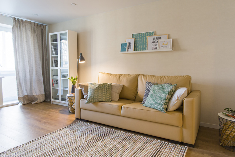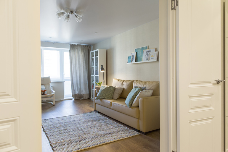 Из прихожей двойные распашные двери в гостиную. В гостиной также всё самое необходимое: раскладной диван, придиванные столики (выполняют также функцию хранения подушек, пледа), кресло, стеллаж, ТВ с тумбой.