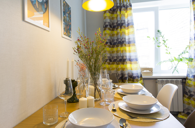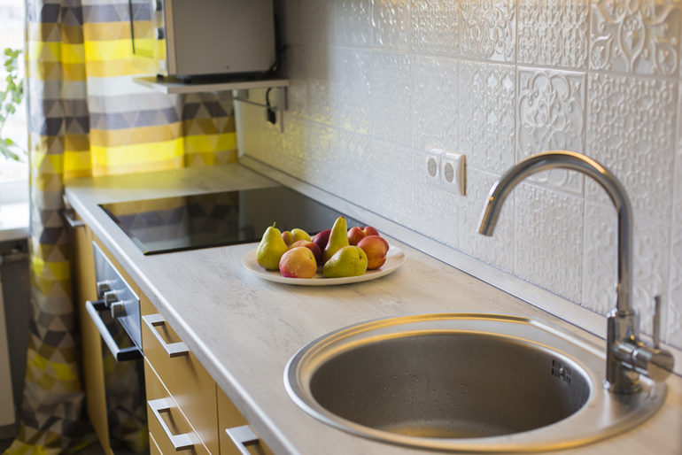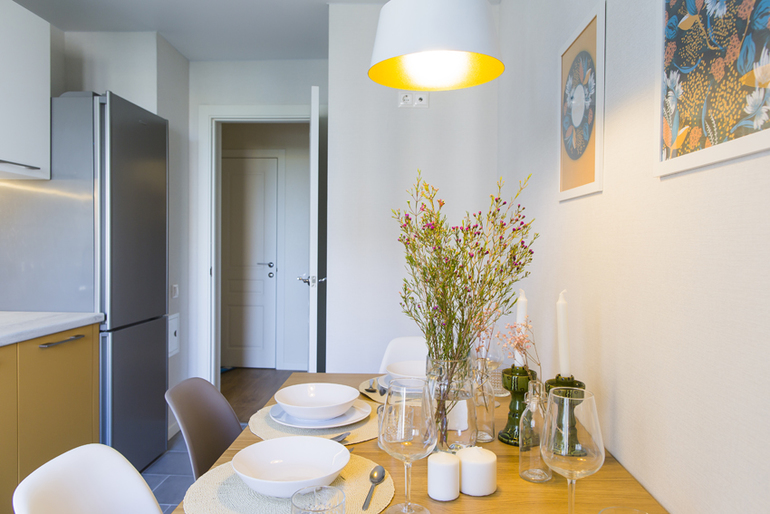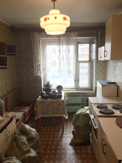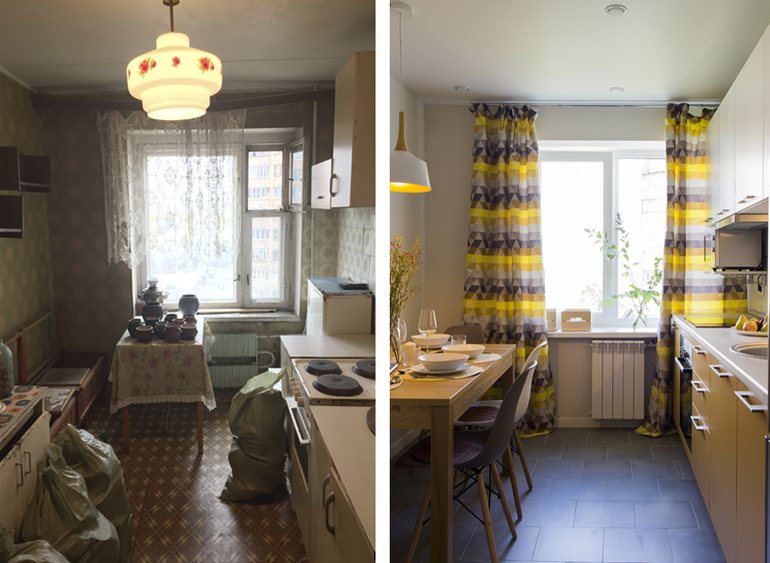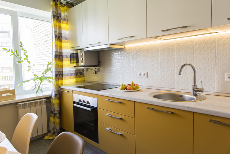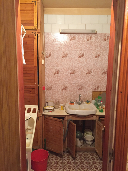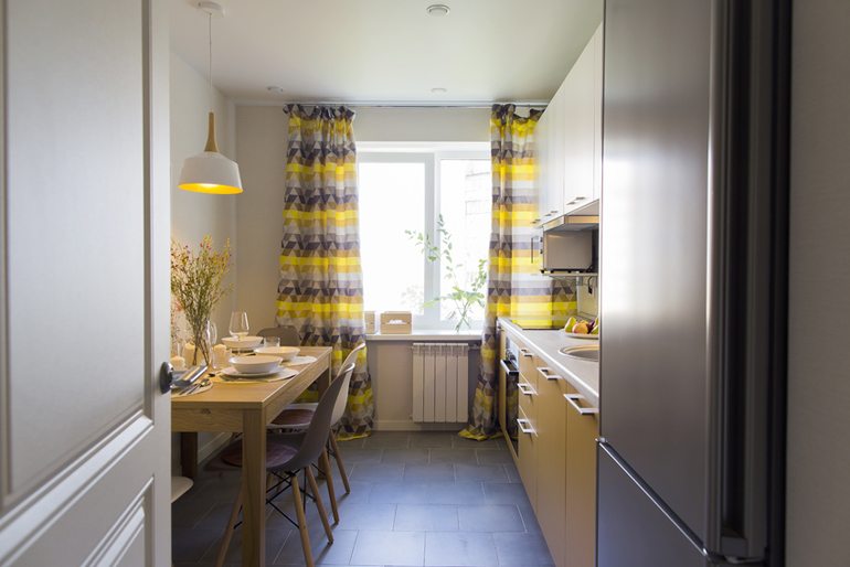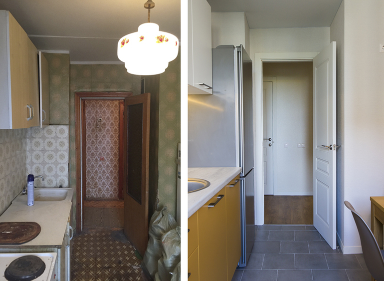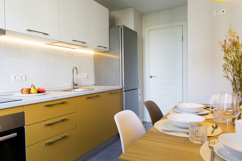 Далее кухня. Т.к. кухня небольшая, необходимо было там расположить всё самое необходимое: варочная панель, мойка, посудомоечная машина, холодильник, свч, раскладной стол.
