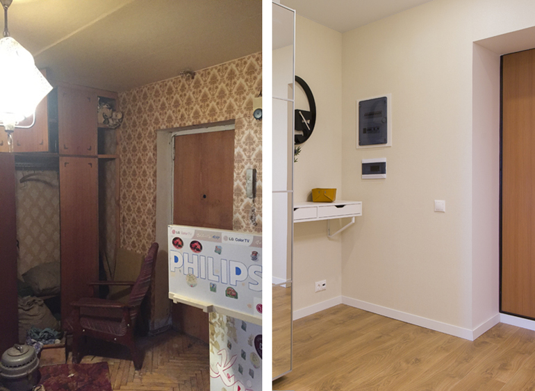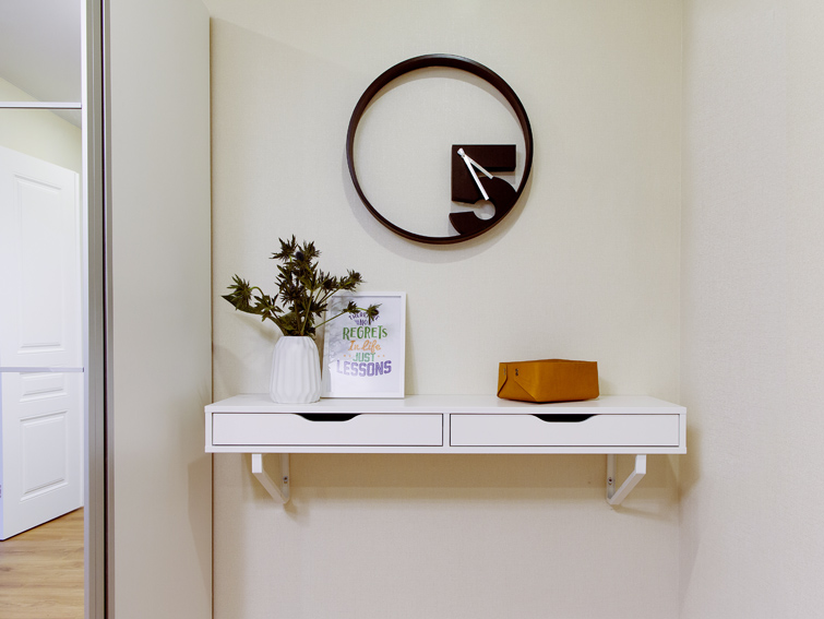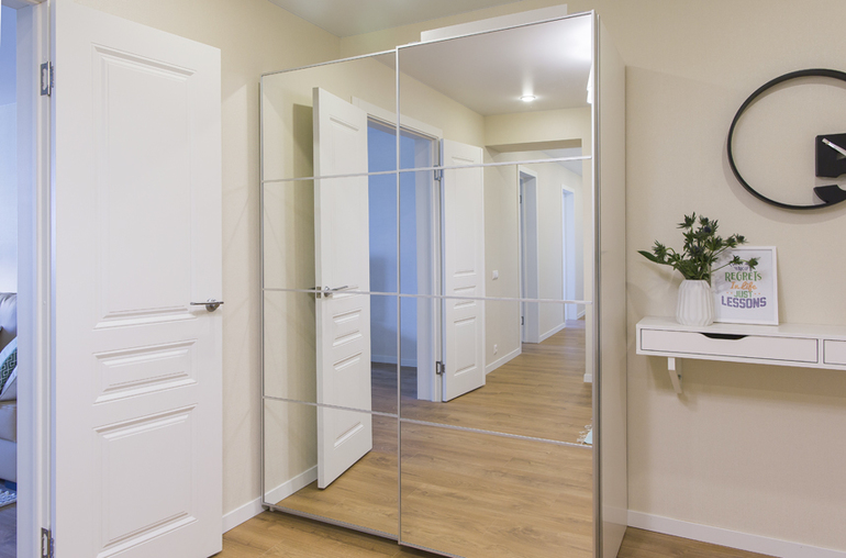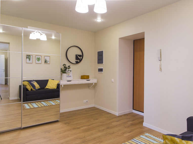 Прихожая. Предусмотрели шкаф для верхней одежды с зеркальными дверьми, диванчик и консоль, чтобы при входе было куда положить ключи и всякие мелочи.