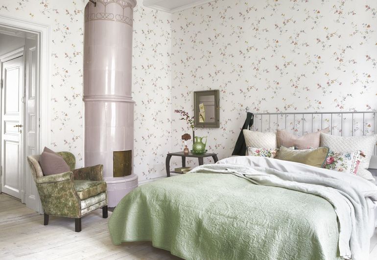 Поклейте обои такие же как на картинке с лампой - они очень нежные. и создадут в комнате пространство за счет мелкого рисунка.