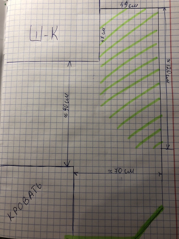 На рисунке сверху слева - шкаф-купе, внизу слева - угол кровати, а справа внизу показала расположение окна (зелёным), которое тоже добавляет мне вопросов как расположить зеркало 😐 И зелёная штриховка это тот самый угол, который хочется занять, места не так уж и мало получается, но из-за такой планировки всю голову сломала.