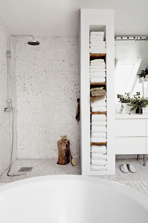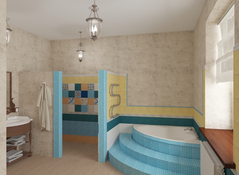 Эти перегородки...как в совдеповском общественном туалете......Изменила бы пространство душевой, там же элементарно холодно будет! Вот на фото и просто и средиземноморьем пахнет. Вы угробите кучу денег на мозаичные ступени...