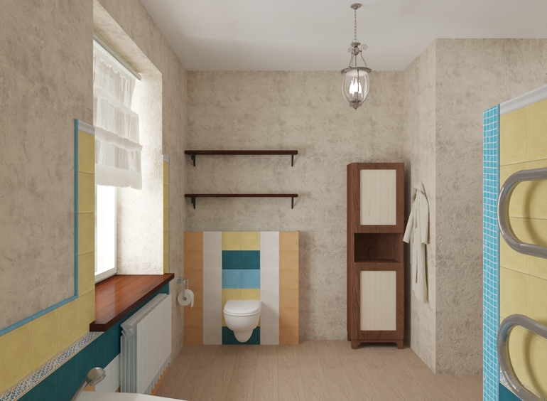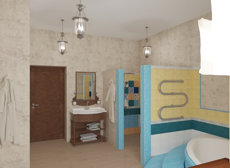 По цветам не понравилось... извините. Мне кажется надо либо оставить бежевый целиком, либо тогда уж делать всё ярким, таким, как голубой и желтый. А вместе эти цвета, как то не смотрятся. Площадь огромная, можно прям супер сделать! А шкафы под полотенца и всякие туалетные принадлежности не хотите поставить?